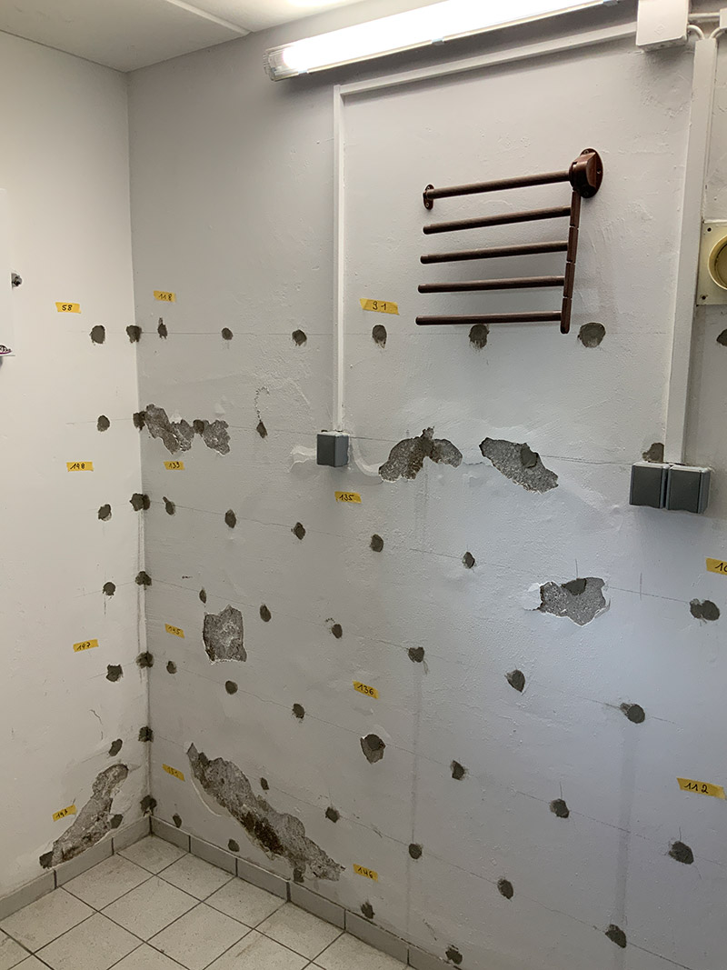 Im Fall einer Querdurchfeuchtung reicht eine einfache Sperre gegen aufsteigende Feuchtigkeit möglicherweise nicht aus. Bei BKM.MANNESMANN bieten wir eine dauerhafte Lösung dafür: die Flächensperre. Hierbei wird die gesamte erdberührte Wandfläche gegen Durchfeuchtung abgedichtet. Um sicherzustellen, dass die gesamte Fläche effektiv hydrophobiert wird, werden schachbrettartige Bohrungen (Bild 2) durchgeführt und das entsprechende Material in die Wand eingebracht. Dieses Verfahren kann bei homogenem Mauerwerk angewendet werden, einschließlich Hohlkammersteinen mit durchgehenden Mörtelfugen. Die Flächensperren im BKM.MANNESMANN-System zeichnen sich ebenfalls durch ihre hohe Haltbarkeit aus, was einen deutlichen Vorteil gegenüber anderen Produkten darstellt.